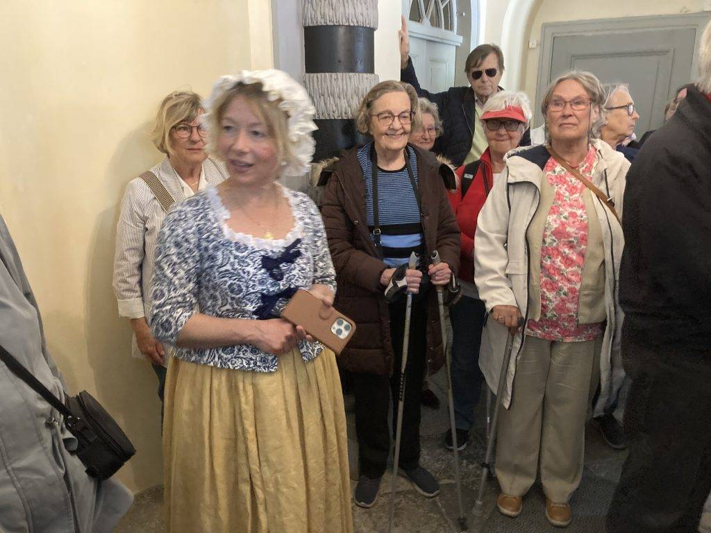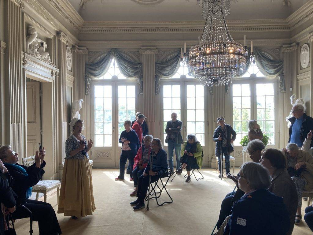 Vi har Inger Ernstsson med oss som guide i bussen. Redan efter en stund berättar hon om Nääs slott som vi ser på vägen, och sedan får vi höra hela berättelsen om tillkomsten av Gunnebo och Inger Ernstssons arbete som intendent med restaureringen av trädgården och byggnader på Gunnebo. Det är en imponerande berättelse om hur man lyckades att få en ansenlig summa för arbetet och även startade utbildningar för 1700-talets hantverk.