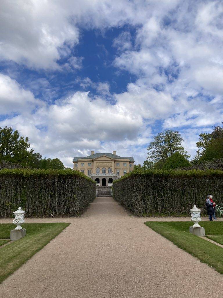 En majmorgon stiger vi in i bussen för att åka till Gunnebo slott och Torpa stenhus. Vi är två föreningar, Bibliotekets vänner och Humanistiska förbundet.